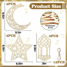 American Elm 12 Pcs Ramadan Wooden Pendant Ornaments- Paintable Durable Moon Star Lantern Shape Hollow Decoration