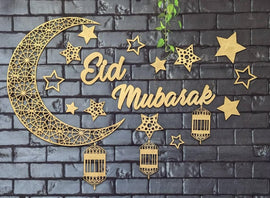 American Elm Eid Home Decor Set - Ramadan Crescent, Stars, Lanterns, Wooden Cutouts, Islamic Wall Décor
