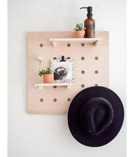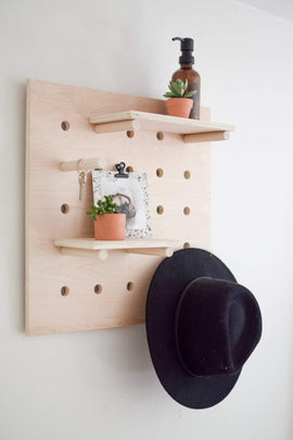 Product Description Beautiful and functional handcrafted pegboard display made from all-natural Birch plywood by AmericanElm. Perfect for use as a wall organizer in any room, including bedroom, bathroom, and living spaces. Also works great as a store or market display! The pegboard and shelves...- Rs. 1,999.00
