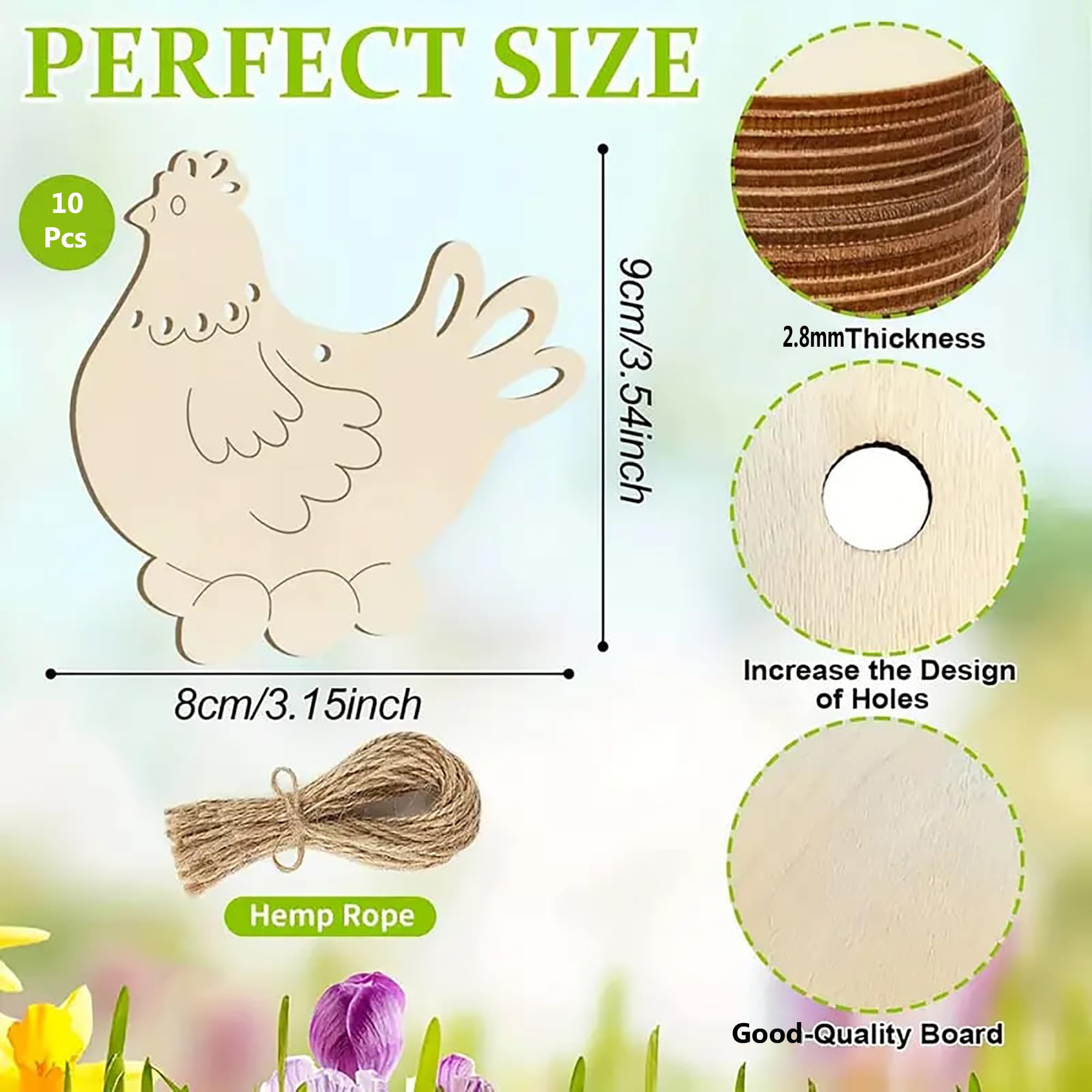 Celebrate Easter and Spring with Cliths Wooden Hen-Shaped Easter Ornaments – a delightful craft kit designed for fun, creativity, and festive charm. This pack includes 10 good-quality unfinished wooden hen cutouts, each measuring 3.54 x 3.15 inches and 2.8mm thick, along with durable hemp rope for easy hanging.
