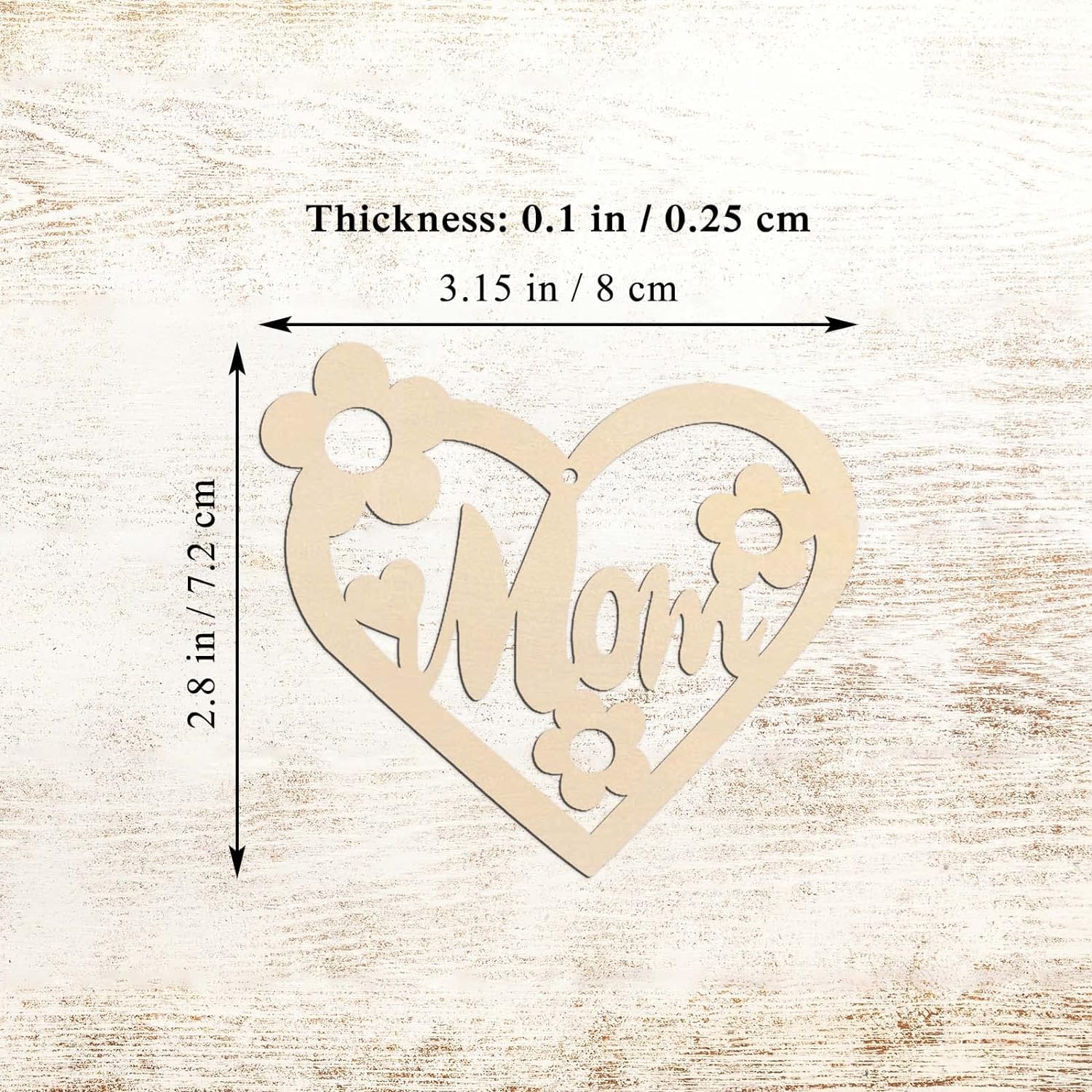 Elevate your crafting projects with these charming Wooden MOM Heart Shaped Ornaments. Made from high-quality natural wood, each ornament is precisely laser-cut and polished, measuring approximately 3.15x2.8x0.1 inches. This pack includes 20 pieces of MOM-shaped ornaments with heart flower designs, equipped with holes and hemp ropes for convenient hanging.