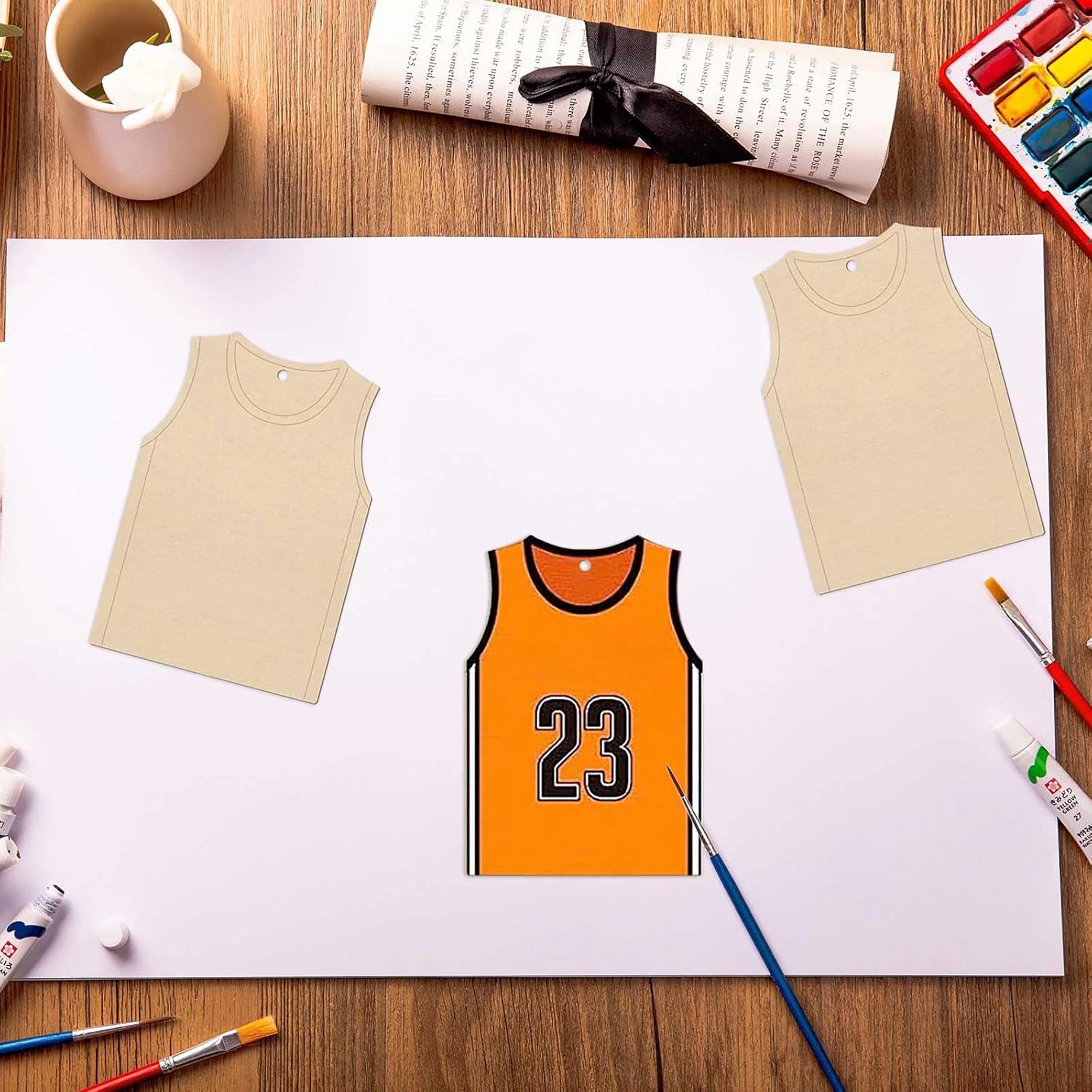 This American Elm 10 Piece Set features authentic basketball jersey shapes (10x7 cm / 3.94x2.76 inches) in 2.7mm MDF. Unfinished and ready for team spirit, these blanks transform into personalized sports treasures.