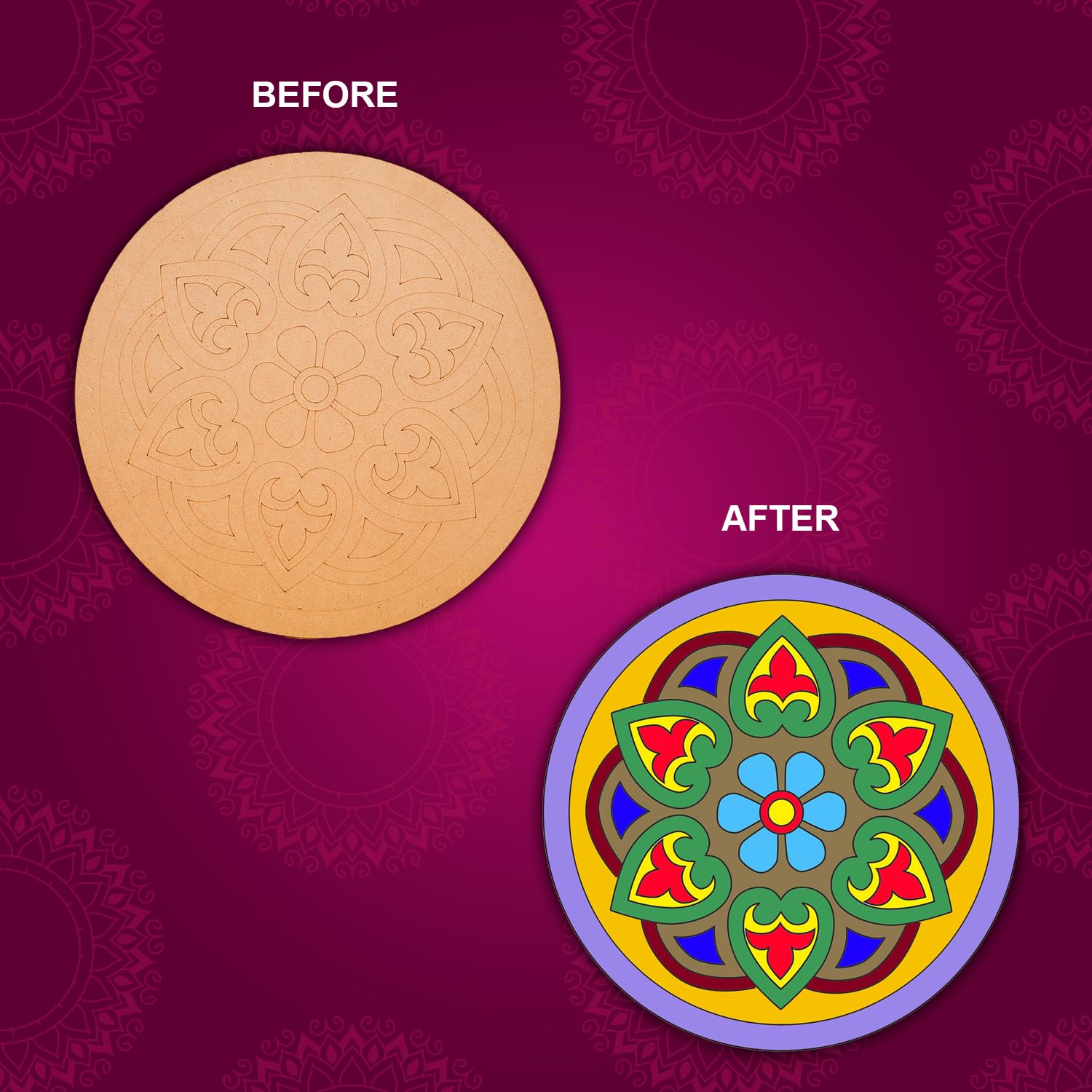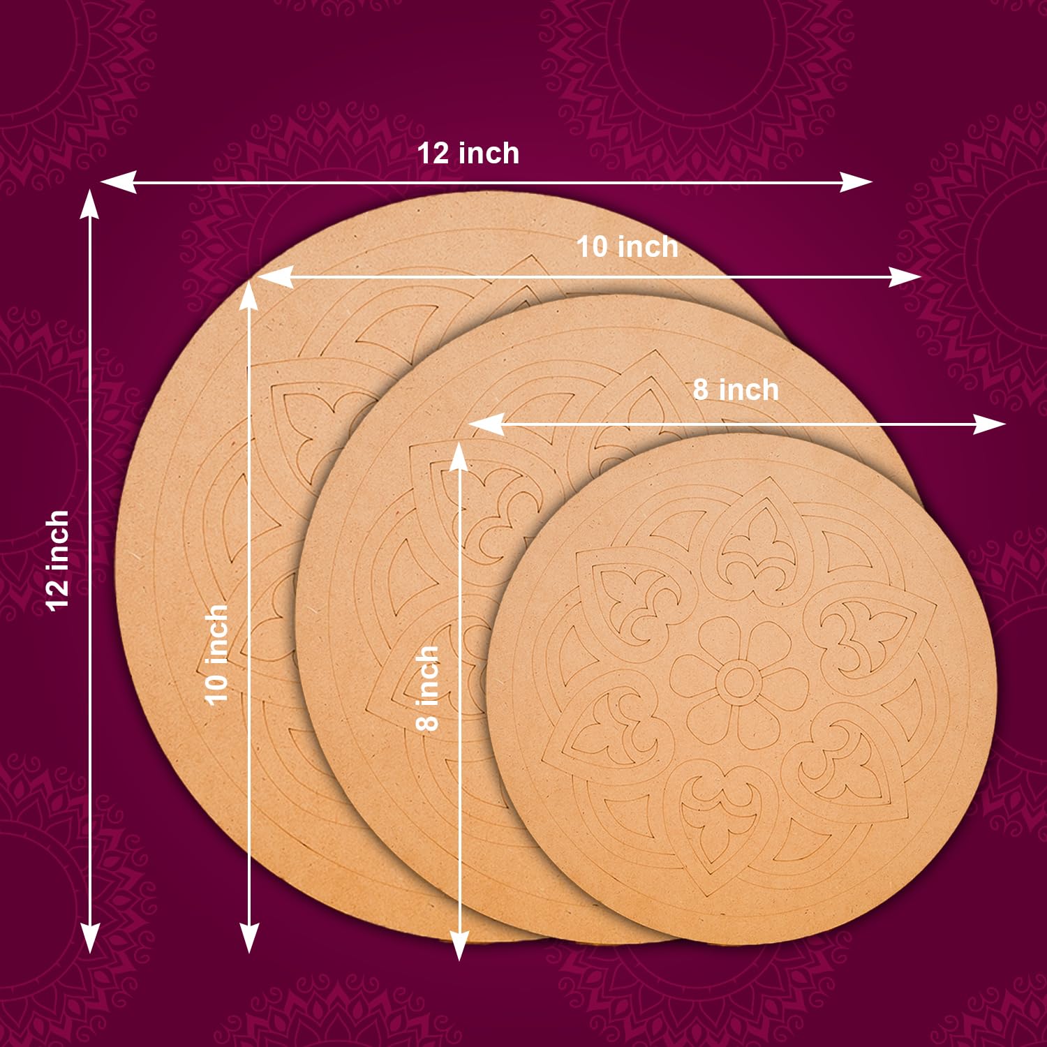 This American Elm 3-Piece Art Board Set features good 8", 10", and 12" MDF circles with authentic pre-marked designs for Lippan, Mandala, and Madhubani art forms.