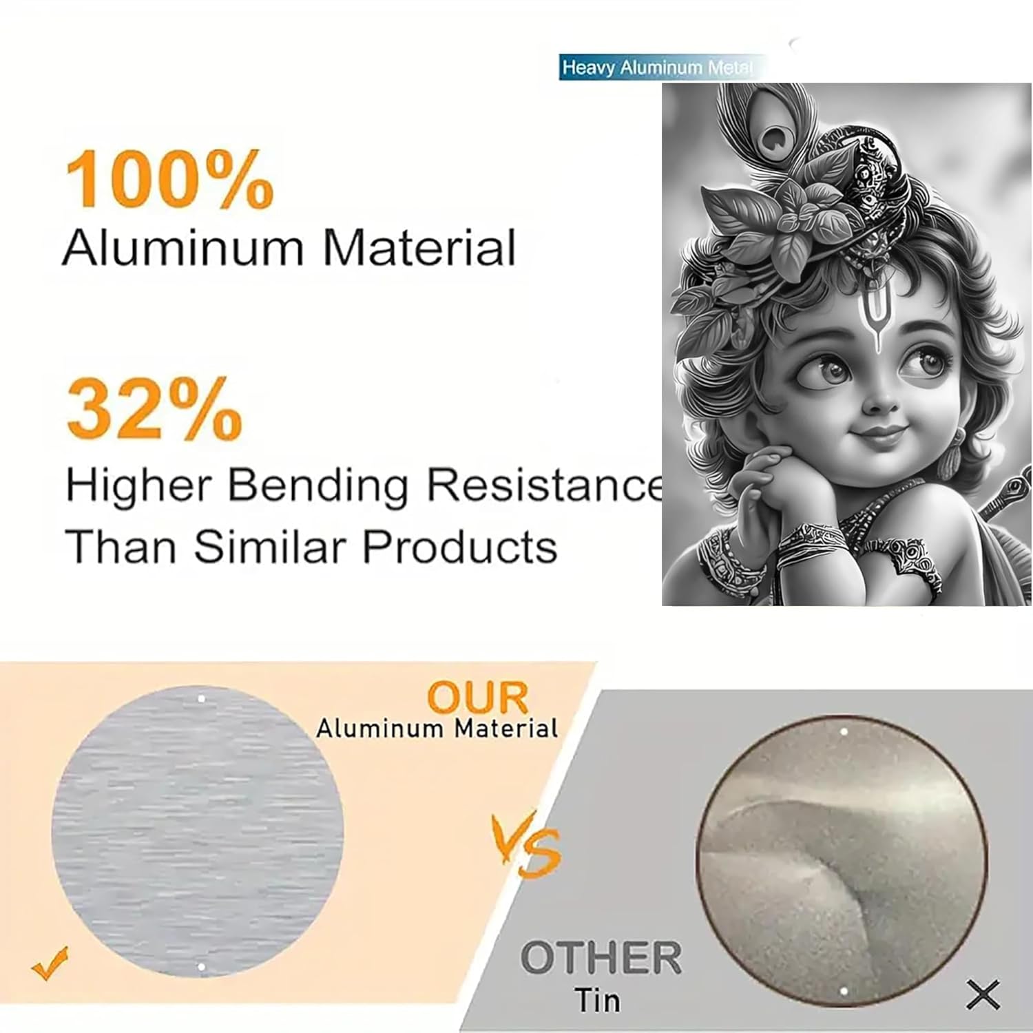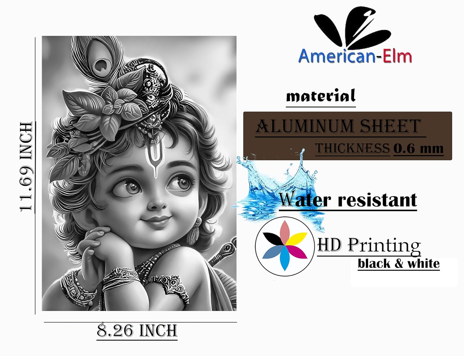 Elevate your sacred spaces with this American Elm Baby Krishna Metal Print, featuring a striking high-definition black and white image on premium 0.6mm aluminum.