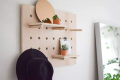 AmericanElm Beautiful and functional handcrafted pegboard display made from all-natural Birch plywood. MADE IN INDIA. Perfect for use as a wall organizer in any room, including bedroom, bathroom, and living spaces. Also works great as a store or market display!