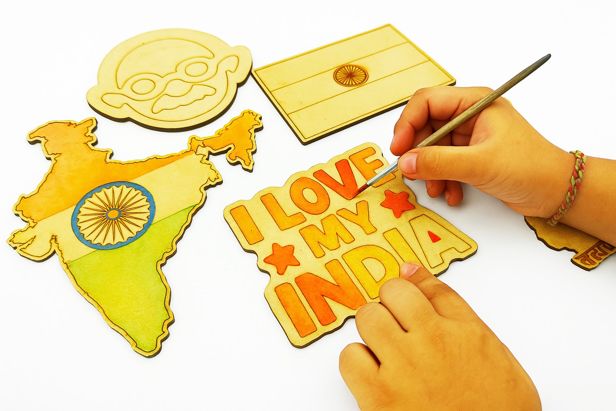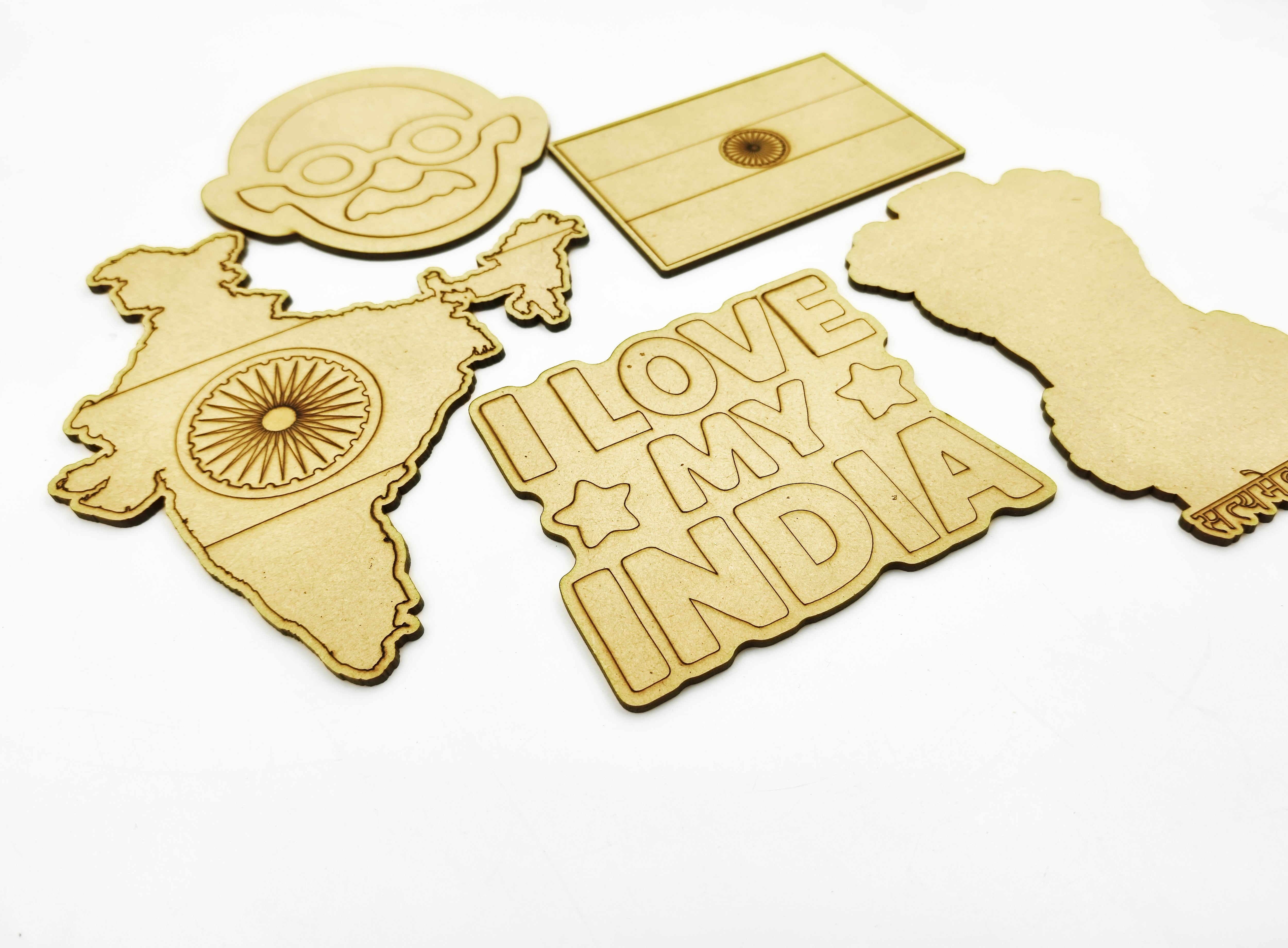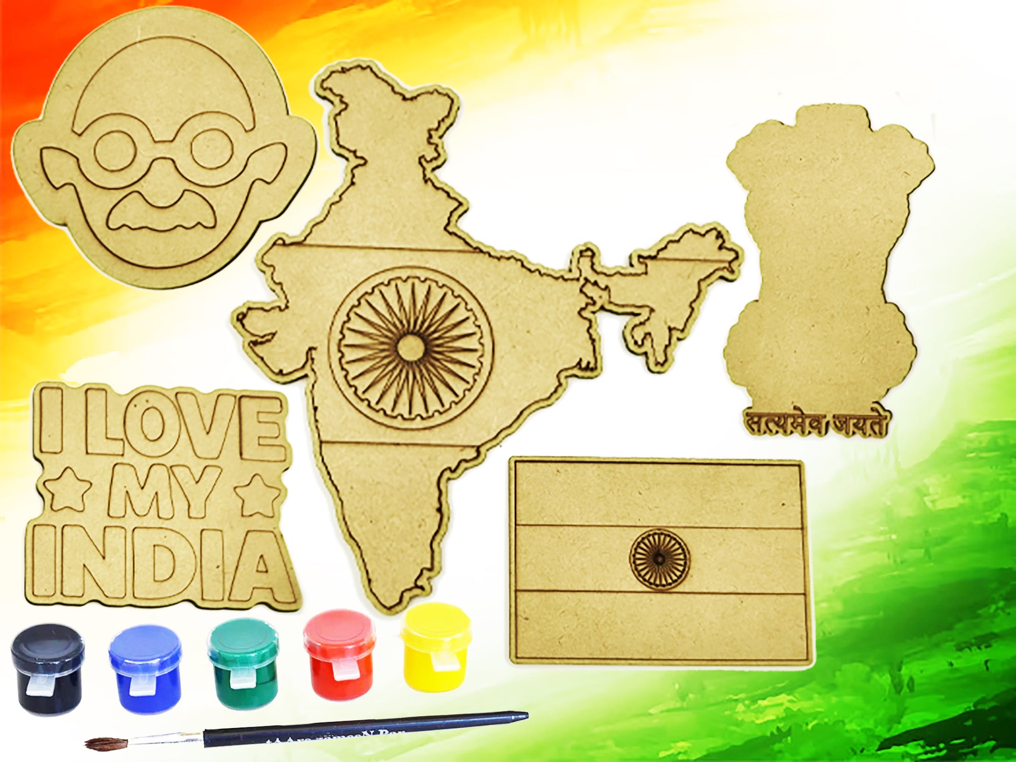 Celebrate India's rich heritage with this complete wooden craft kit featuring five iconic designs! The set includes good 2.7mm pine MDF cutouts of a 15.3x14 cm (6.02x5.5 inch) India map, 10.3x10 cm (4.05x3.93 inch) Mahatma Gandhi silhouette, 7x10.2 cm (2.75x4.01 inch) national flag, 12.8x8.2 cm (5.03x3.22 inch) Ashoka pillar, and 10.2x8.6 cm (4.01x3.38 inch) "I Love My India" design - plus vibrant paints and brush for immediate creativity.
