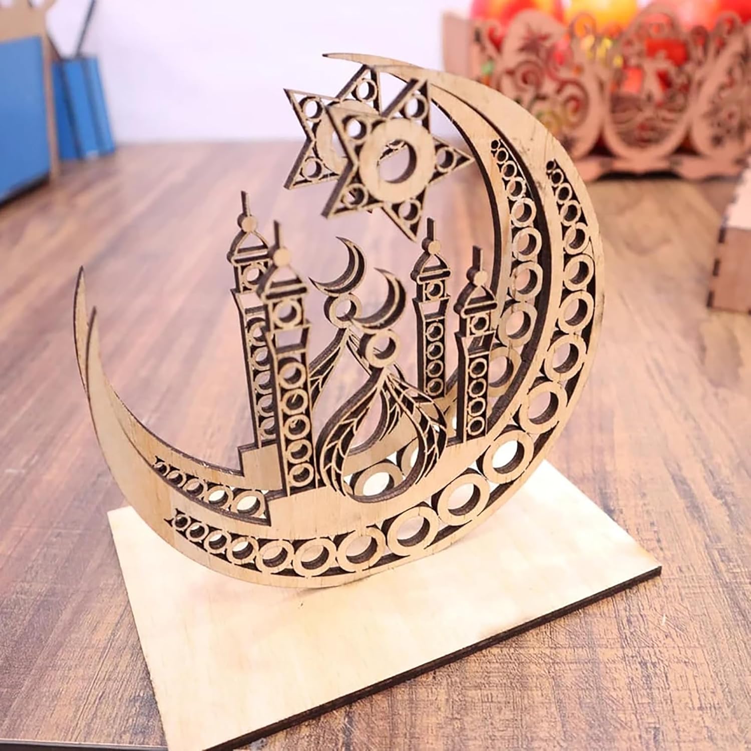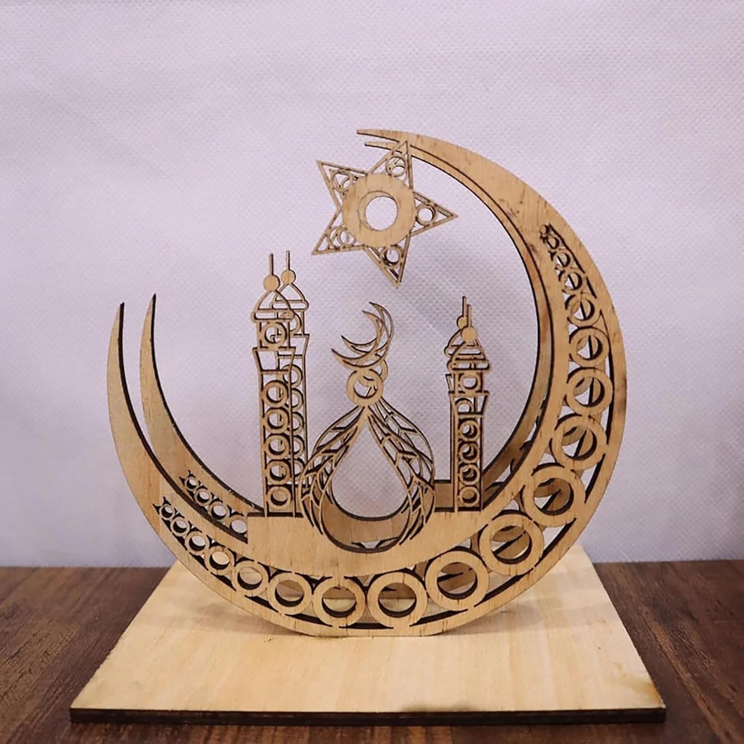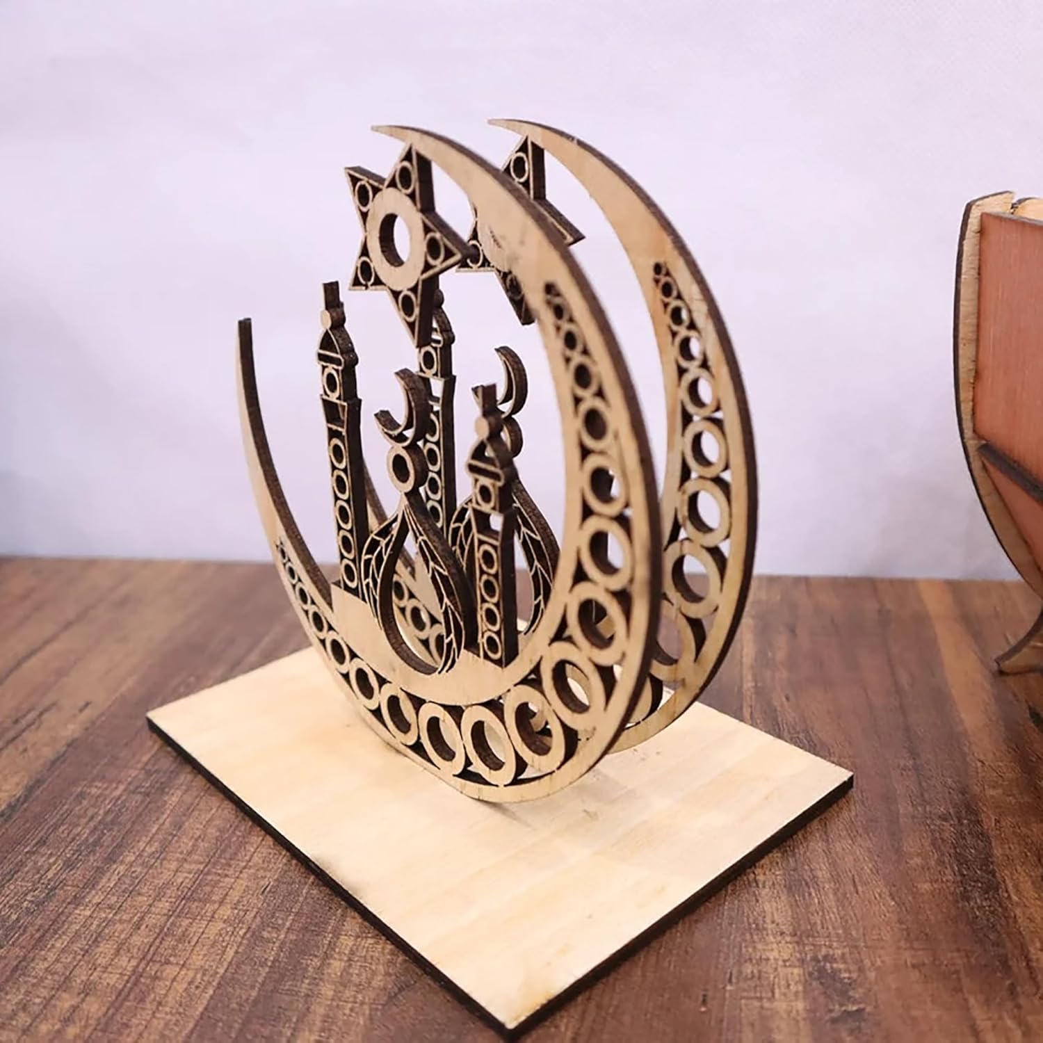 Enhance your sacred spaces with this handcrafted Islamic decor piece from Cliths.com. Standing 25 cm (10 Inches) tall, this elegant crescent moon is crafted from durable 2.7mm MDF, designed to bring spiritual warmth to your Ramadan and Eid displays.