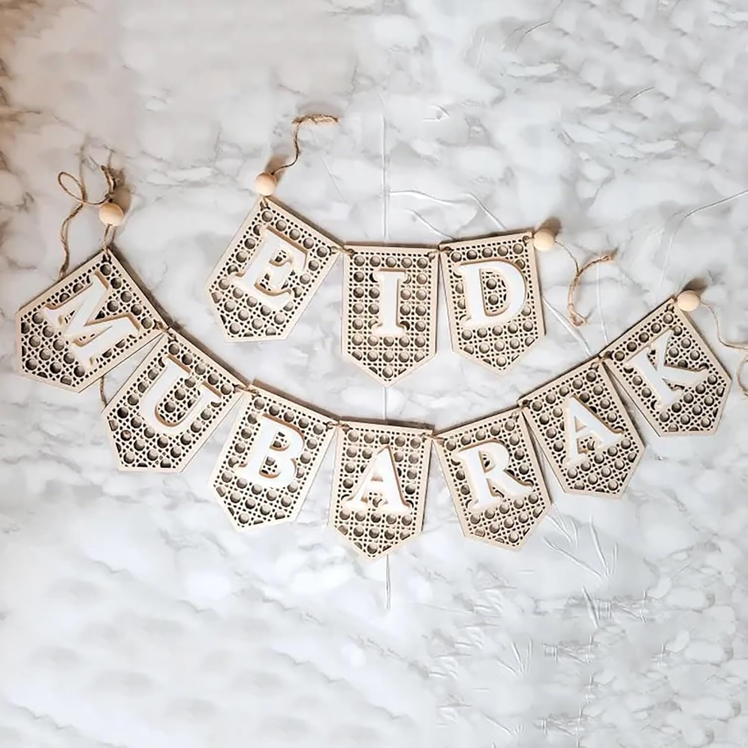 Welcome the blessed season with this handcrafted Islamic banner from Cliths.com. Measuring 18 cm x 13 cm (7.08x5.11 Inches), this durable 2.7mm MDF decoration displays "Eid Mubarak" in elegant script, complete with pre-attached hanging rope for effortless display.
