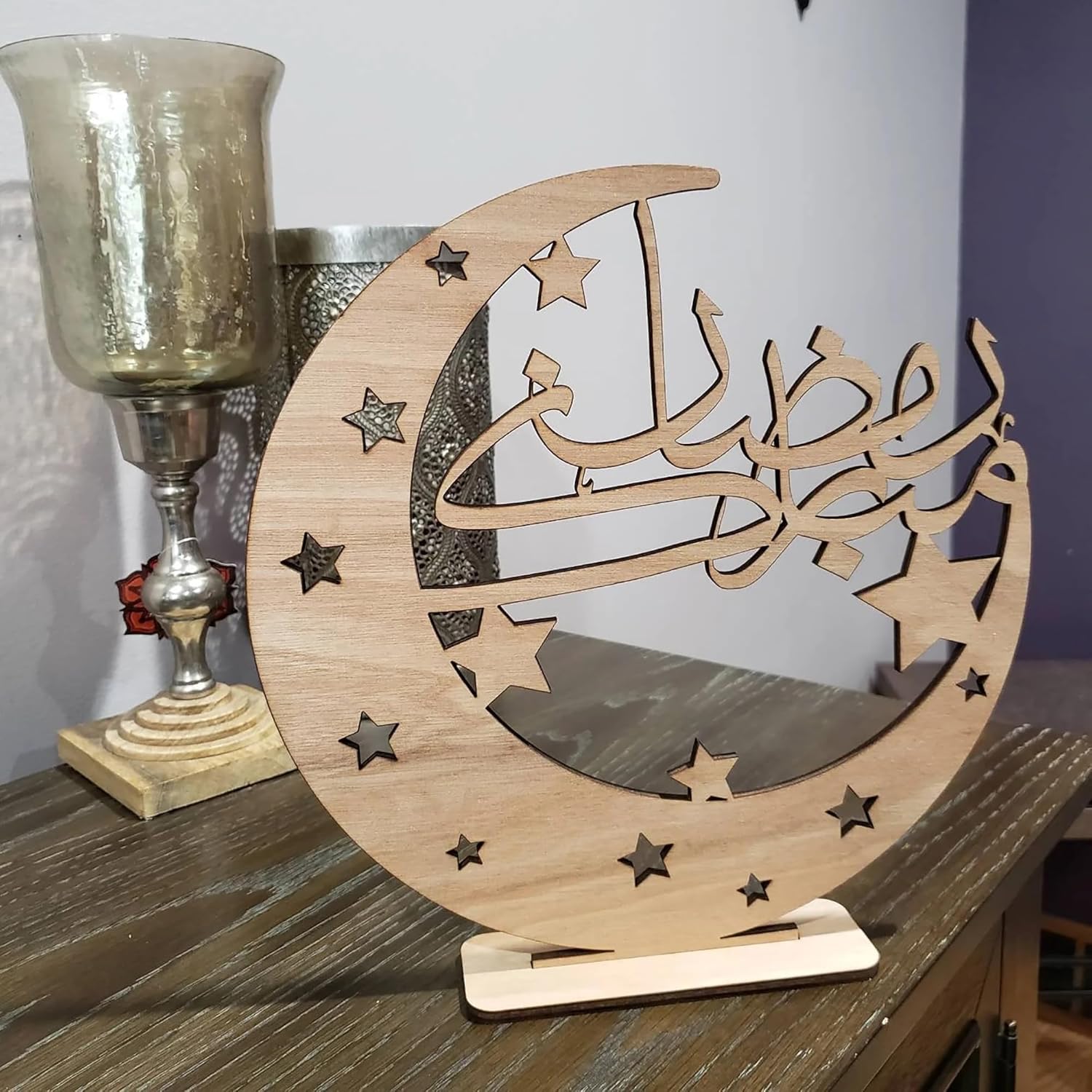 Celebrate the holy month with this handcrafted 23 cm wooden crescent moon from Cliths.com. Crafted from 2.7mm MDF, this freestanding decoration brings traditional Islamic elegance to your Ramadan and Eid displays.