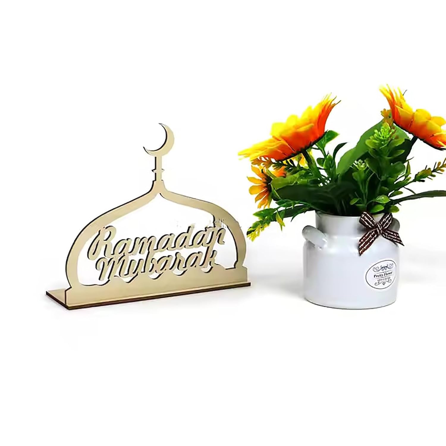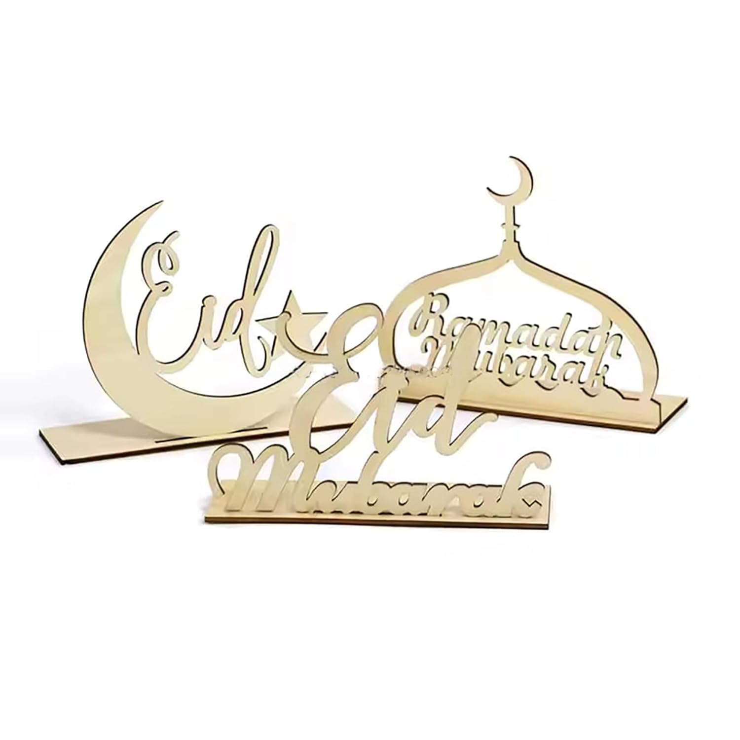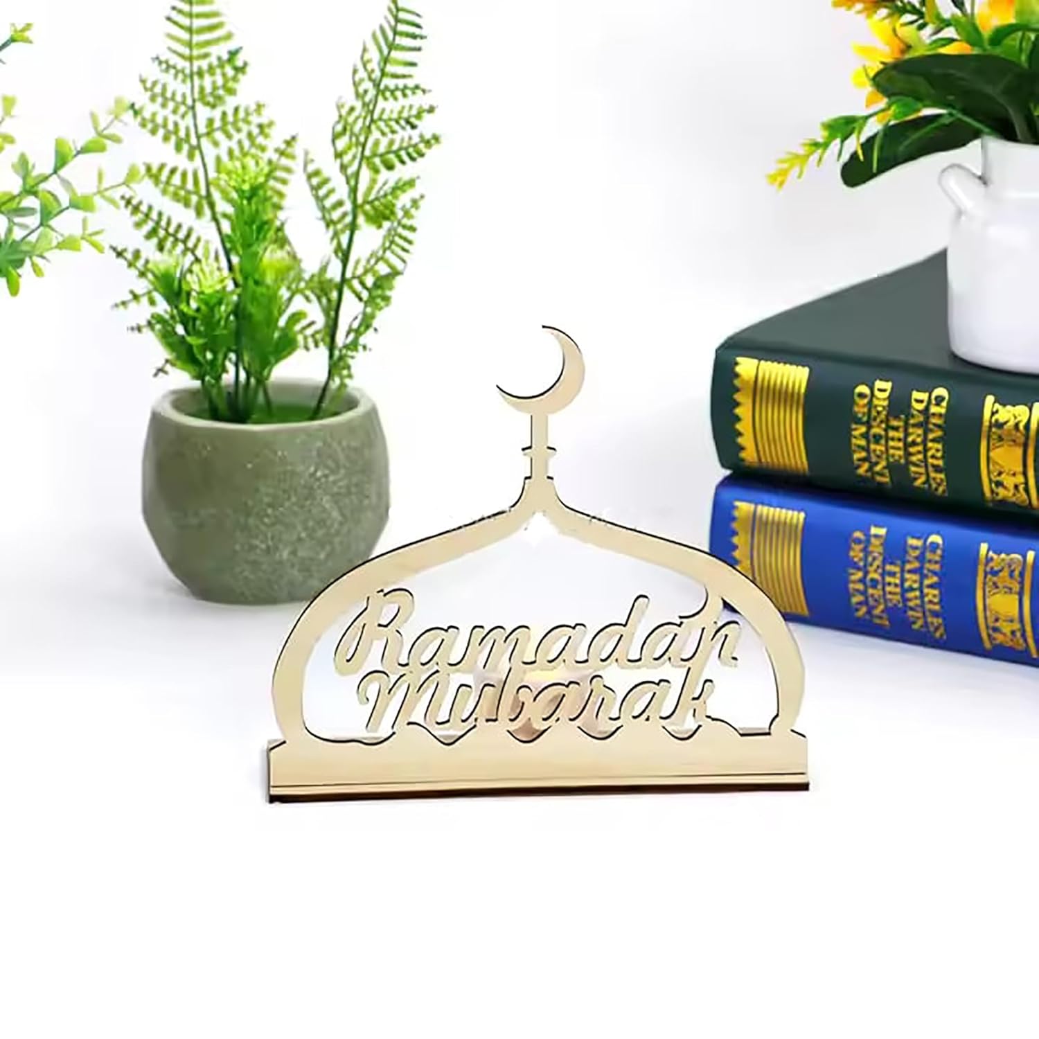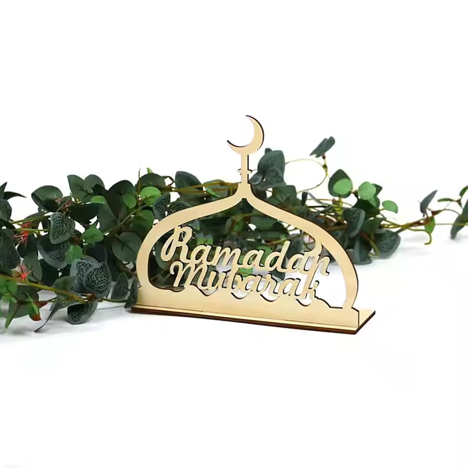 Elevate your festive tablescapes with this handcrafted wooden decoration set from Cliths.com. Featuring a mosque (15 cm), crescent moon (13 cm), and "Ramadan Mubarak" script, each piece is laser-cut from 2.7mm MDF for enduring beauty.