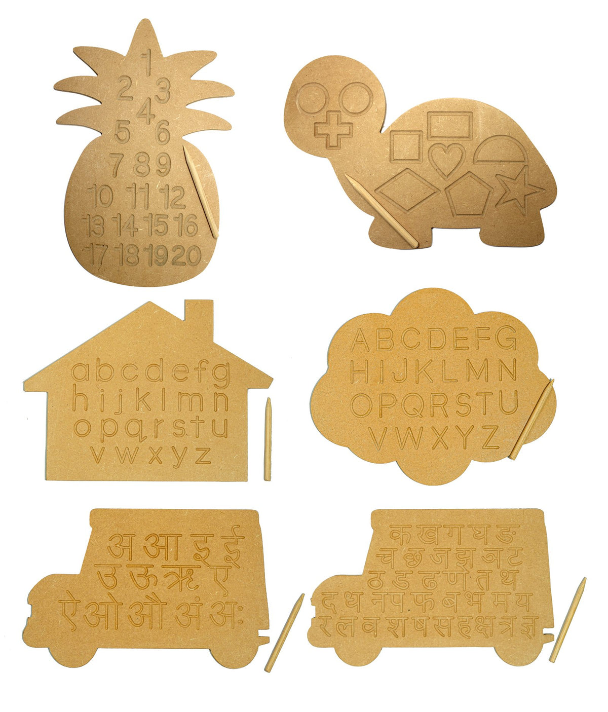 Encourage your kids to think logically, move precisely, and play creatively! This Pack of 6 alphabets tracing board for kids helps children develop both cognitive thinking and fine motor skills as they carefully Learn, understand and recognize the different shapes, Numbers and Alphabets. Use these wooden learning toys as an opportunity for learning shapes, introducing geometry and building skills and size recognition. Or, just set it up for your little one to enjoy as a fun and engaging on-their-own activity.