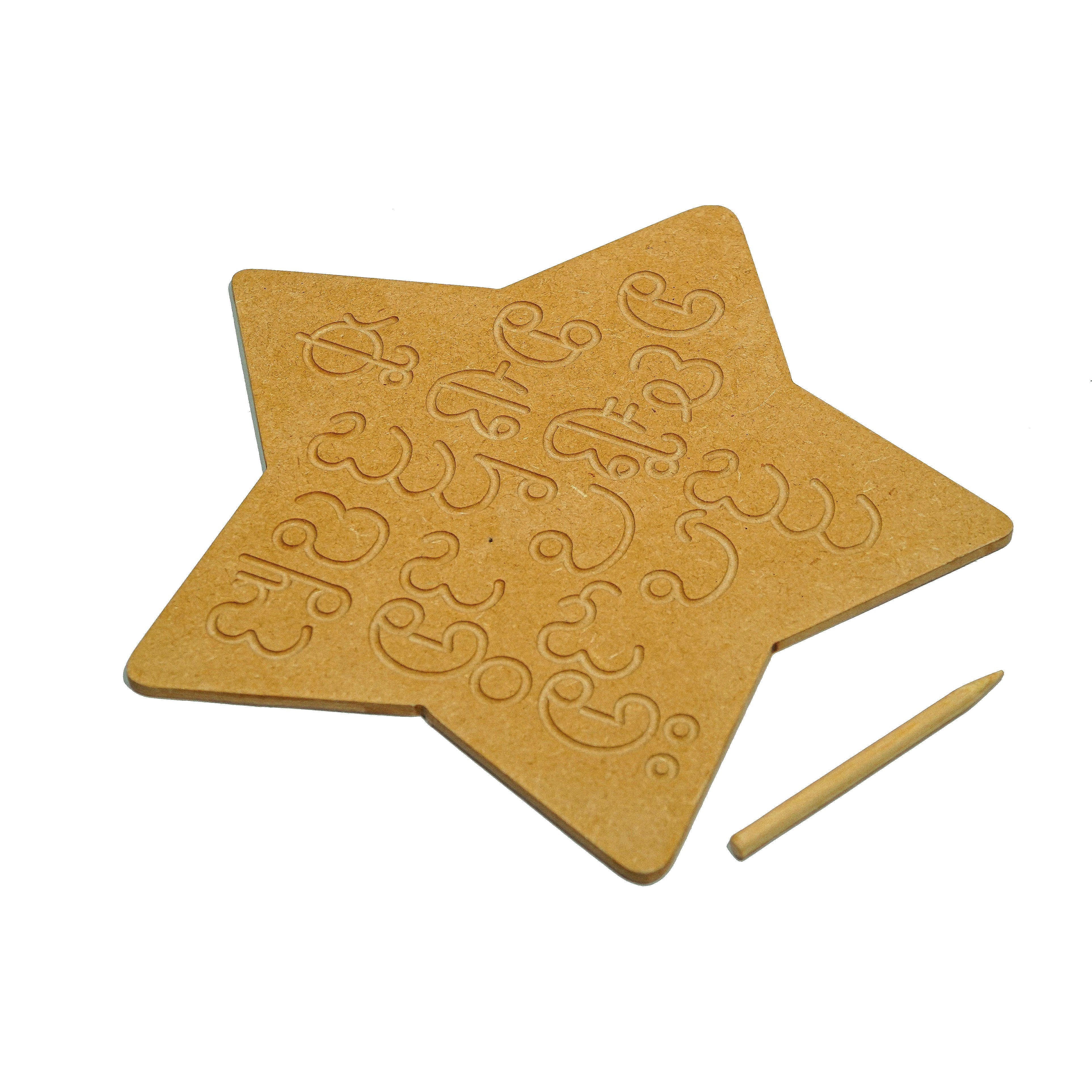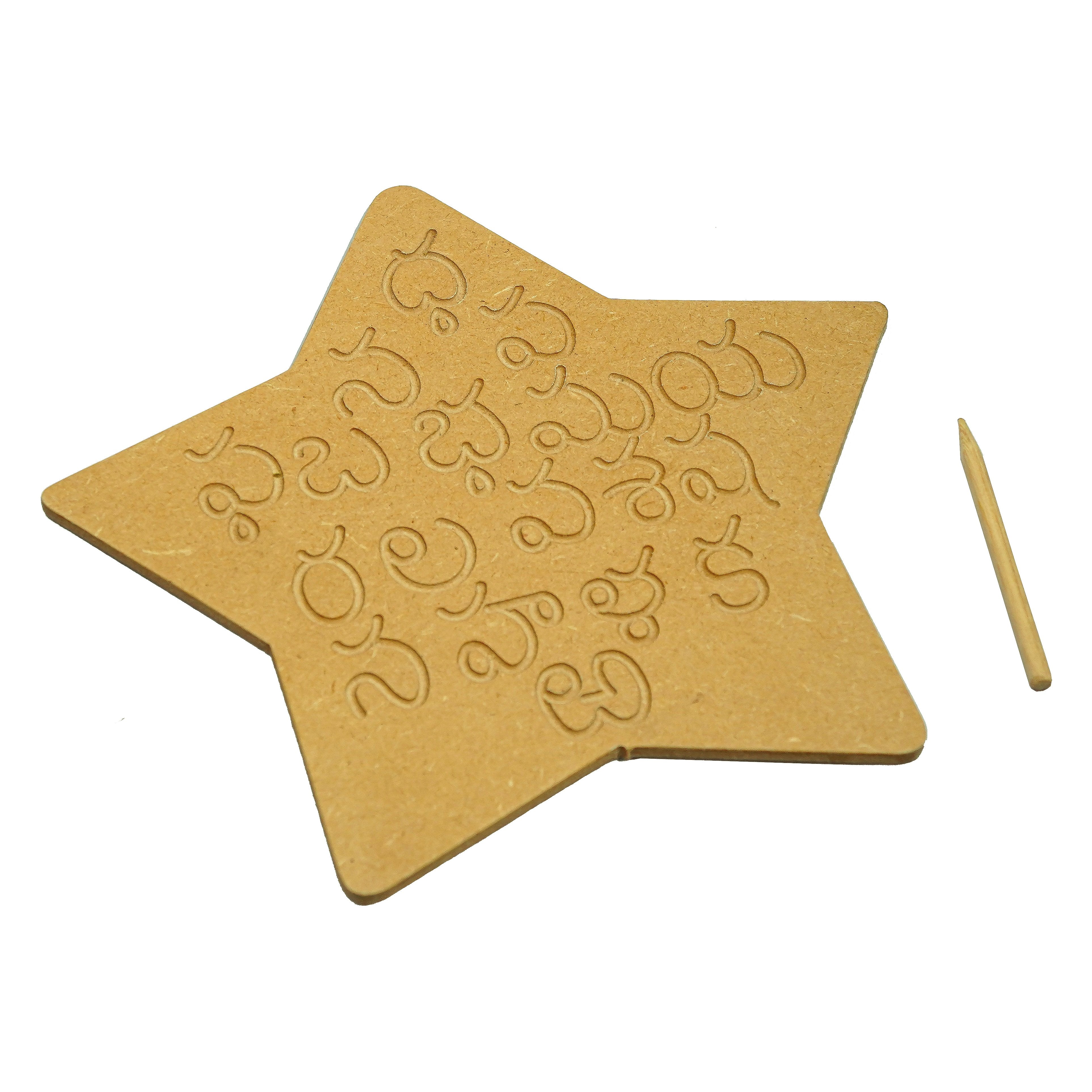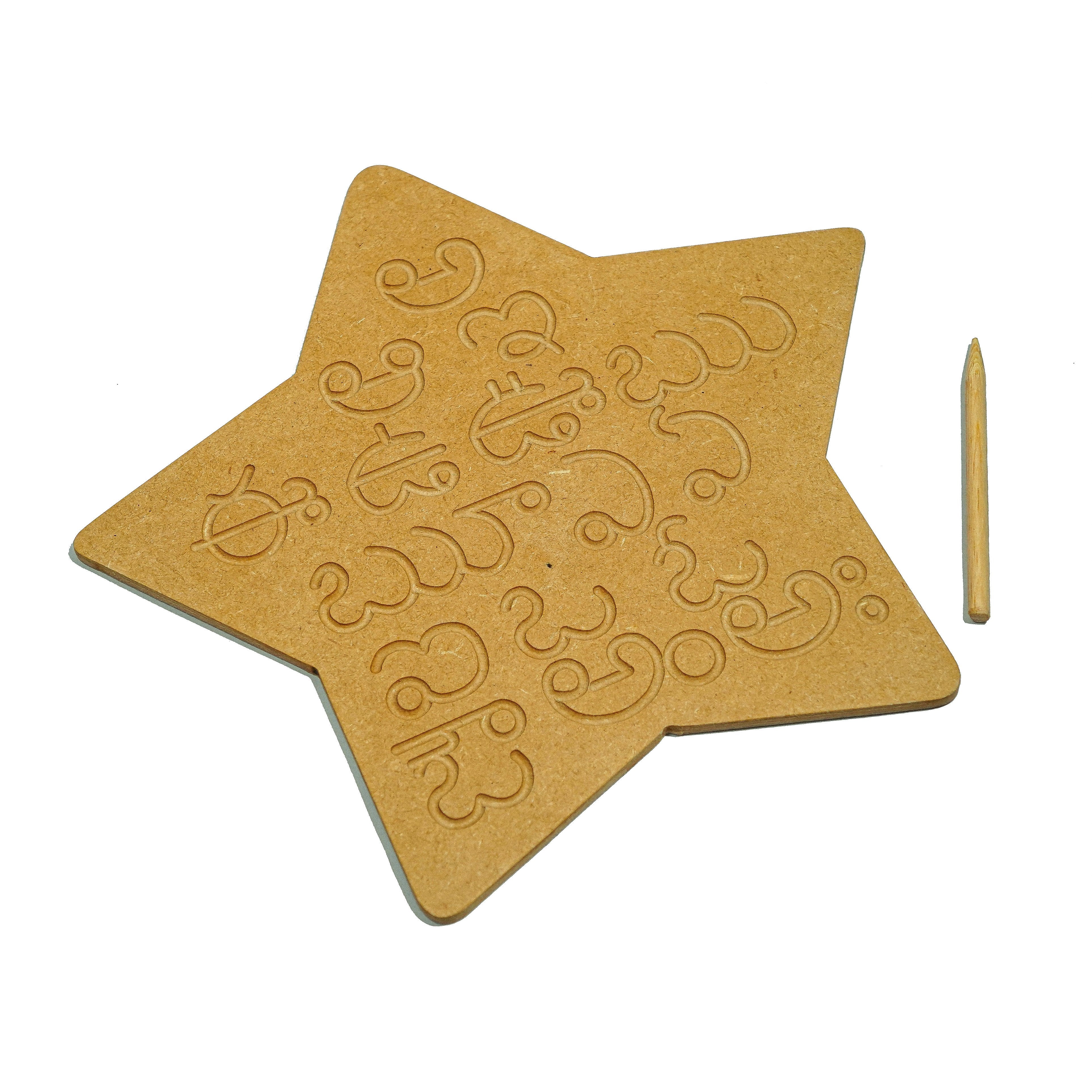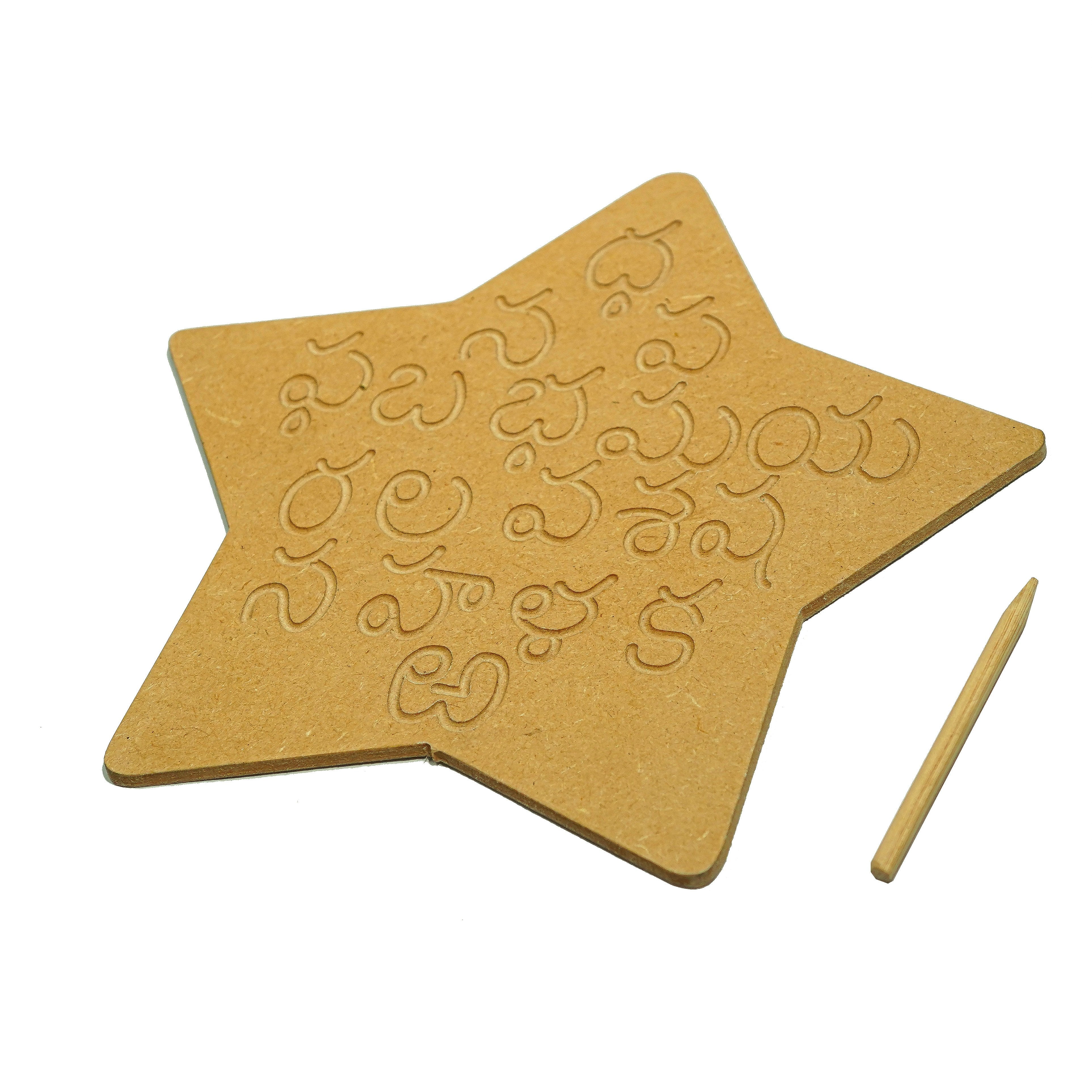 This is a wonderful engraved board to help your child for brain development to form the alphabet correctly. The set contains all the Telugu alphabets engraved on natural MDF board and a wooden dummy pencil. Child can use the wooden pencil to trace the Telugu alphabets on the board. The Telugu Alphabet Tracing Board helps: To learn sequencing and correct order of the Telugu vowels and consonants To learn and improve their motor skills, sequencing and many other subtle skills. Builds their confidence and thinking skills too. Contains: 3 Boards & Dummy Pencils