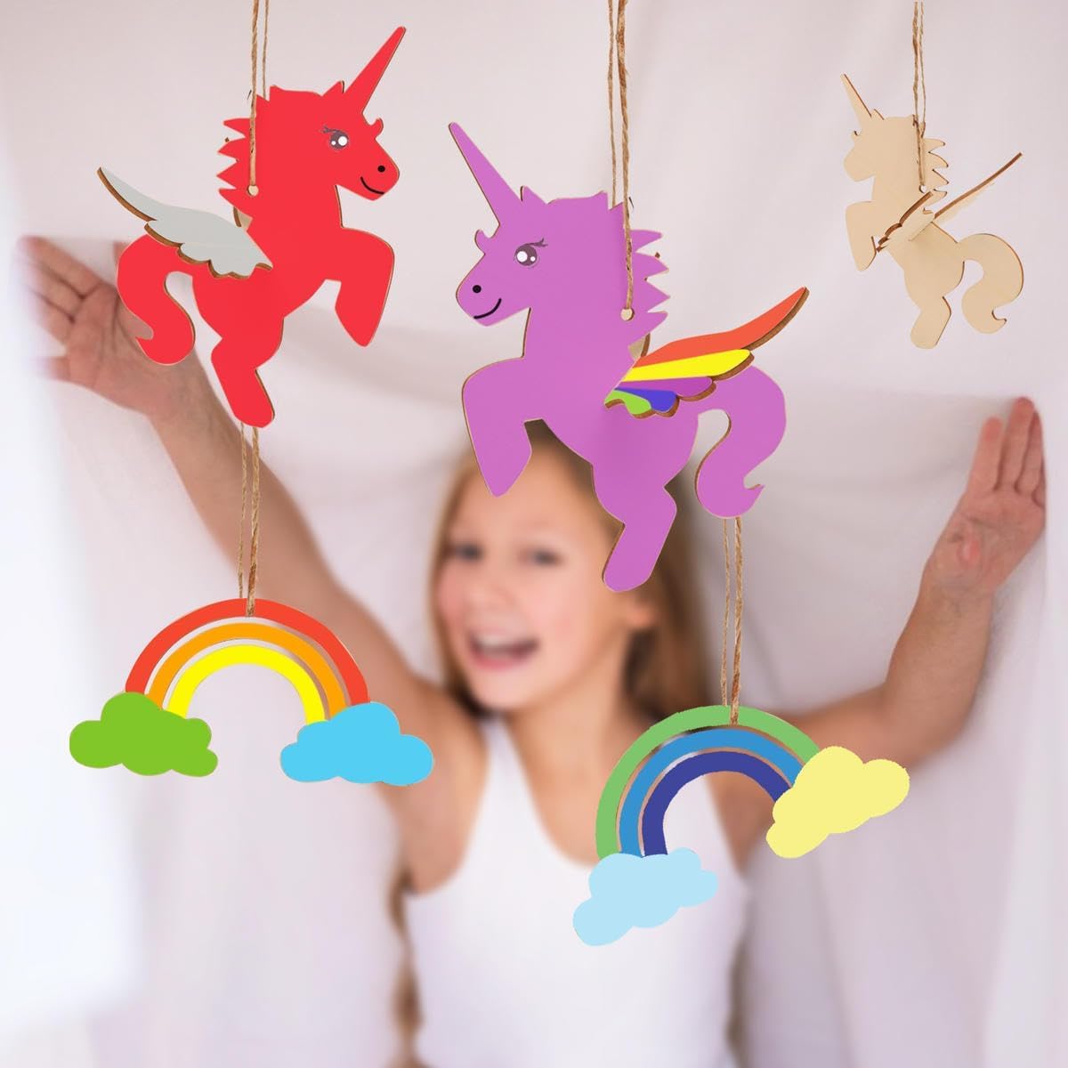 Unleash the creativity within your child with our Wood Kids Crafts Unicorn Craft Rainbow Paint Your Own Sets. Perfect for arts and crafts enthusiasts, these kits offer a fun and engaging way for children to express themselves through creative projects. With 9 wooden pieces and a roll of rope for hanging, this set is ideal for creating magical and unique decorations that will brighten up any space. Bring joy and creativity into your child's life with our all-inclusive craft kit.